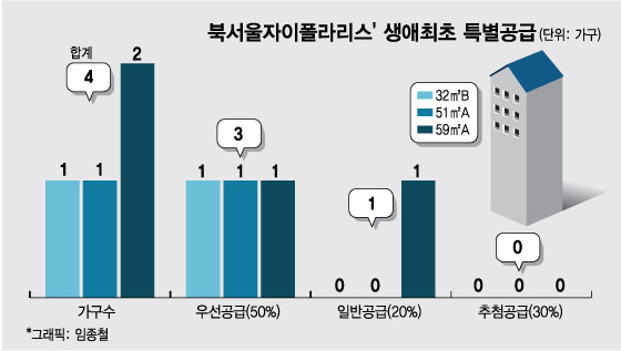 '북서울자이폴라리스'의 경우, 생애최초 특별공급 물량은 총 공급가구수 327가구 가운데 4가구에 불과했다. 현행 주택공급에 관한 규칙에 따르면 민영주택의 경우, 건설량의 10%를 생애최초 특별공급으로 공급해야 한다. '북서울자이폴라리스'를 적용하면 32가구 이상이 배정돼야 맞다.