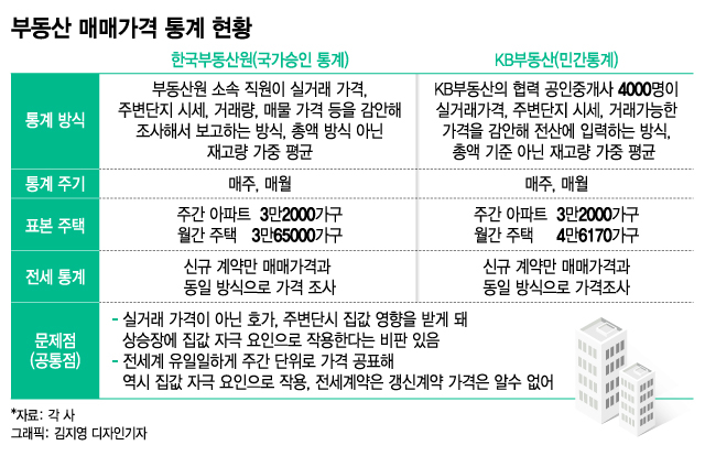양대 부동산 통계인 부동산원과 KB시세에 사실상 집주인이 부르는 호가가 상당 부분 영향을 줄 수밖에 없는 구조다. 매매거래가 주간 단위로 이뤄지지 않는 만큼 결국 조사원이나 공인중개사의 주관이 들어갈 수밖에 없고 특히 공인중개사는 집값이 올라야 수수료를 더 받는 특성상 호가를 적극 반영하는 상황이 벌어질 가능성도 크다. 서영수 키움증권 연구위원은 "주식시장에는 매수 호가와 매도 호가가 공개돼 가격이 자연스럽게 책정되지만 부동산 시장에는 매도 호가 밖에 없다"며 "매수 호가가 반영되지 않는한 정확한 가격이라고 볼 수 없다"고 지적했다.