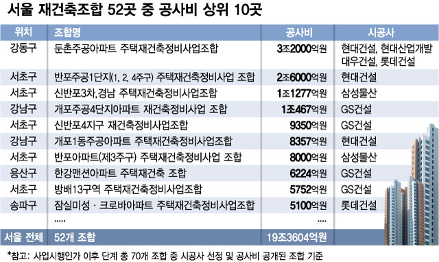 2일 머니투데이가 서울에서 진행 중인 재건축 사업을 전수조사한 결과, 사업시행 인가를 받은 조합이 총 70곳 달하고 이 가운데 52곳이 시공사를 산정한 것으로 확인됐다. 52개 조합의 총 공사비는 19조3604억원이다. 공사비가 사업비의 약 70%를 차지한다는 점을 감안하면 총사업비는 약 27조원이 넘을 것으로 추정된다.