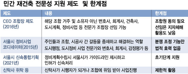 서울시는 지난 2015년부터 정비사업 코디네이터 제도를 시행 중이다. 주민과 조합, 시공사간 갈등을 조율하는 전문가를 파견하는데 주로 분쟁조정 역할에 집중돼 있다. 법적인 효력도 없어 한계점이 많다. 지난해 도입된 서울시 신속통합기획 정비사업은 정비계획 수립 단계에서만 서울시가 일종의 컨설팅을 해준다. 일부 조합들은 금융전문가 등으로 구성된 신탁사를 재건축 시행자로 지정하거나 위탁하지만 비용이 들고 활성화 속도도 더디다.