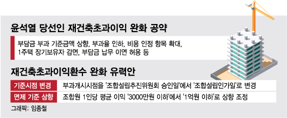 윤 당선인은 후보 시절, 재건축 규제 중 하나인 재초환 제도를 완화하겠다고 공약했다. 부담금 부과 기준금액을 상향하고 부과율 인하, 비용 인정 항목 확대, 1주택 장기보유자 감면, 부담금 납부 이연 허용 등이 세부과제다.