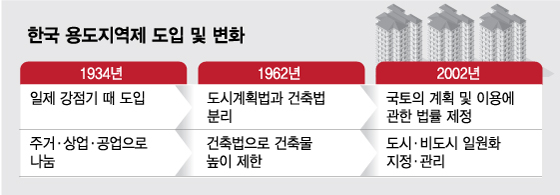 용도지역은 주거지역의 환경을 헤치는 시설이 들어서는 것을 막기 위해 도입됐다. 유럽과 미국에선 1800년대부터 시행됐고 한국에는 일제강점기인 1934년에 도입됐다. 도시계획에 관한 최초 법령인 '조선시가지계획령'이 제정되면서 주거, 상업, 공업 등 3개의 용도지역으로 나눴다. 1962년 건축법이 제정되면서 시가지계획은 도시계획법으로, 건축물은 건축법으로 높이 등을 제한했다. 2002년에 '국토의 계획 및 이용에 관한 법률'을 제정하면서 도시지역과 비도시지역을 일원화해 용도지역을 지정·관리하고 있다. 관련 법에는 21개 용도지역, 26개 용도지구, 4개 용도구역이 등장한다. 군사시설 등 다른 법이나 조례에 규정된 지구를 포함하면 700개가 넘는다.
