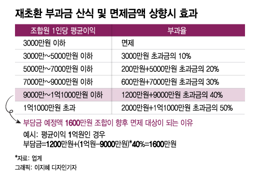 만약 면제기준 1억원 상향안이 그대로 확정되면 재초환 예정부과액 1600만원 이하인 조합은 초과이익 환수 대상에서 빠질 수 있다. 현행 재초환 부과 방식을 역산하면 1인당 부담금 1600만원이 초과이익 1억원인 경우에 해당한다.