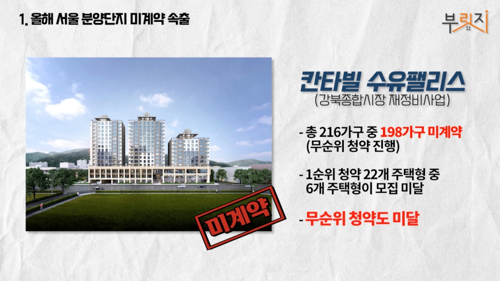서울 강북구 수유동에 들어설 '칸타빌 수유팰리스(강북종합시장 재정비사업)'도 미계약된 198가구에 대해 지난 11일 무순위 청약을 진행했습니다. 정당계약과 예비당첨자 추첨 절차를 거쳐 총 216가구 중 90%를 웃도는 198가구가 주인을 찾지 못해서 입니다. 서울에서 200가구 규모가 미계약으로 남은 것은 2019년 2월 이후 처음 있는 일입니다. 하지만 이 단지는 11일 진행한 무순위 청약에서도 5개 주택형에서 접수 건수를 다 채우지 못했습니다.