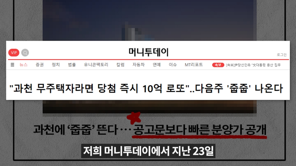 안녕하세요. 부릿지 조한송 기잡니다. 오늘은 지난해부터 약 200 가구가 풀릴 것으로 예고됐던 과천 첫 '줍줍' 소식을 가지고 왔습니다. 머니투데이에서 지난 23일 가장 먼저 소식을 전해드린 바 있죠. 아직 입주자모집공고도 나오지 않았지만 '부릿지'가 후속으로 분양가를 입수해 여러분께 알려드립니다. 과천에 거주하는 무주택 세대주라면 누구나 청약할 수 있고 추첨을 통해 당첨자를 뽑습니다. 당첨 즉시 얻는 시세차익만 '10억원' 수준이 될 전망입니다. 자세한 내용 살펴보시죠.