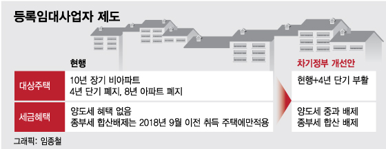하지만 새 정부에서는 등록임대주택 임대의무 기간을 채운 뒤 매도할 경우 양도세 중과를 적용하지 않고 일반세율로 과세한다. 공시가격 6억원 이하 주택이라면 종부세 합산 배제 혜택도 다시 주어진다.