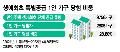정부는 지난해 11월16일 이후 입주자모집승인을 신청하는 주택부터 생애최초 특별공급 물량의 30%를 1인가구도 도전이 가능한 추첨제로 공급했다. 제도 시행일부터 올해 4월말까지 약 6개월 동안 민영주택 생애최초 전체 공급 물량은 9756가구로 이 중에서 1인 가구 당첨자가 2805가구였다. 전체의 28.8%를 1인 가구가 가져간 것이다. 생애최초 특공의 30%를 '추첨제'로 뽑았는데도 1인 가구가 물량의 대부분을 가져가는 '이변'이 벌어졌다고 볼 수 있다.