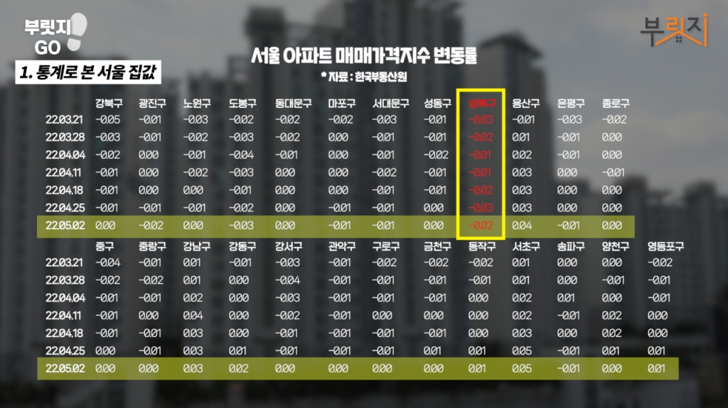 먼저 통계 데이터를 통해 분위기를 살펴보도록 하겠습니다. KB부동산 통계를 보면 서울 전체적으로는 3월 21일 주간 데이터부터 매매변동률이 오르기 시작했습니다. 4월 25일을 기준으로 서울 각 자치구의 매매가격지수 변동률은 미미했습니다. 반면 성북구는 유일하게 하락 전환하며 ?0.03%를 기록했습니다. 5월 2일 기준으로 여전히 마이너스를 기록중입니다. 같은 일자를 기준으로 한국부동산원 통계도 살펴보겠습니다. 4월 25일 기준 강남, 서초, 용산구를 제외한 나머지 지역에서 매매가격지수가 떨어진 가운데 성북구의 감소율이 가장 높았습니다. 5월 2일 강북권 지역들이 보합세로 전환됐음에도 성북구는 여전히 마이너스를 기록했습니다.