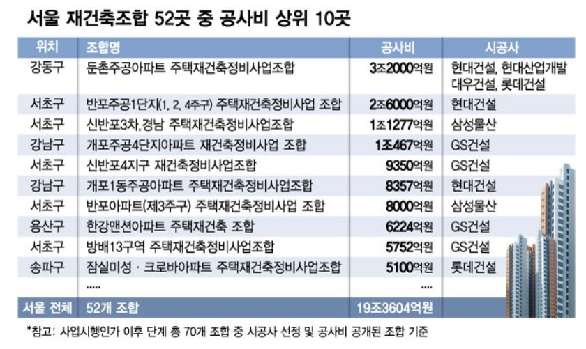 조합방식 재건축은 입주민들이 시공사 선정에서부터 인허가, 분양 등 모든 절차를 알아서 해야 한다. 사업비만 수조원에 달하는데 '동네주민'들로 구성된 비전문가들이 운영하면서 여러 문제점이 불거지고 있다. 서울에서 사업시행 인가를 받은 조합 52곳의 총 공사비만 19조3604억원에 달한다. 각종 비리로 조합 임원진이 바뀌면서 사업이 지연되거나 이로 인해 조합원 분담금이 늘어나는 경우도 적지 않다.
