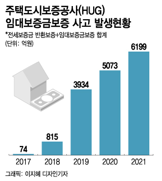 25일 국회와 HUG 등에 따르면 지난해 기준 HUG의 전세보증금 사고 발생건수는 3323건, 6199억원이었다. 전세보증은 집주인이 전세금을 돌려 주지 않아도 보증회사가 대신 갚아주는 상품이다.