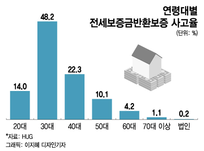 집주인이 전세금을 돌려주지 않아 HUG가 대신 갚아준 금액(사고금액)은 지난 2017년 74억원에서 2019년 3442억원, 2020년 4682억원, 지난해 6000억원을 넘었다. 사고금액의 62.2%는 2030세대에서 발생했다. 30대 비중이 48.2%로 거의 절반에 가깝다. 20대도 14.0%에 달했다.