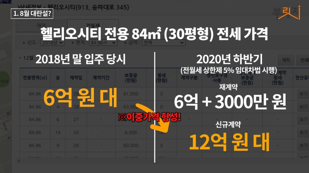 하반기 전세시장을 우려하는 이유는 계약갱신청구권행사로 5% 이상 오르지 못했던 전세 매물이 한꺼번에 쏟아져나오면 2년간 오르지 못한 시세를 반영하면서 전셋값이 급등할 수 있다는 점 때문입니다. 단적으로 헬리오시티의 예를 들 수 있습니다. 2018년 말 집들이를 한 헬리오시티는 9510가구의 국내 최대 규모 아파트 단지입니다. 입주 당시 전세 물량이 늘어나자 30평형인 84㎡(이하 전용면적) 전세 보증금은 6억 원대에 형성됐습니다. 2년 뒤인 2020년 하반기 재계약 시점이 됐을 땐 계약갱신청구권(2년+2년)과 전월세상한제(5%)를 골자로 한 임대차법 시행으로 보증금을 3000만 원 정도만 올려 계약한 경우도 있었습니다. 반면 신규 계약은 12억원대에 체결되면서 신규와 갱신계약간 이중가격이 형성됐는데요. 현재는 이 단지의 전세 호가가 11억~13억원 수준입니다. 올 하반기 2년 계약 만료를 맞은 이들은 최소 5억원 이상의 자금을 마련해야 하는 셈입니다. 강북도 금액의 차이만 있을 뿐 사정은 비슷합니다. 서울 노원구 중계동 중계주공5단지 84㎡ 경우 2020년 4억~5억원 선에서 전세 계약이 체결됐는데, 현재 호가는 7억~7억5000만원 선입니다. 임대차법 시행 2년이 되는 8월부터 이런 물건은 보증금으로 최소 2억원은 올려 줘야 재계약이 가능합니다.