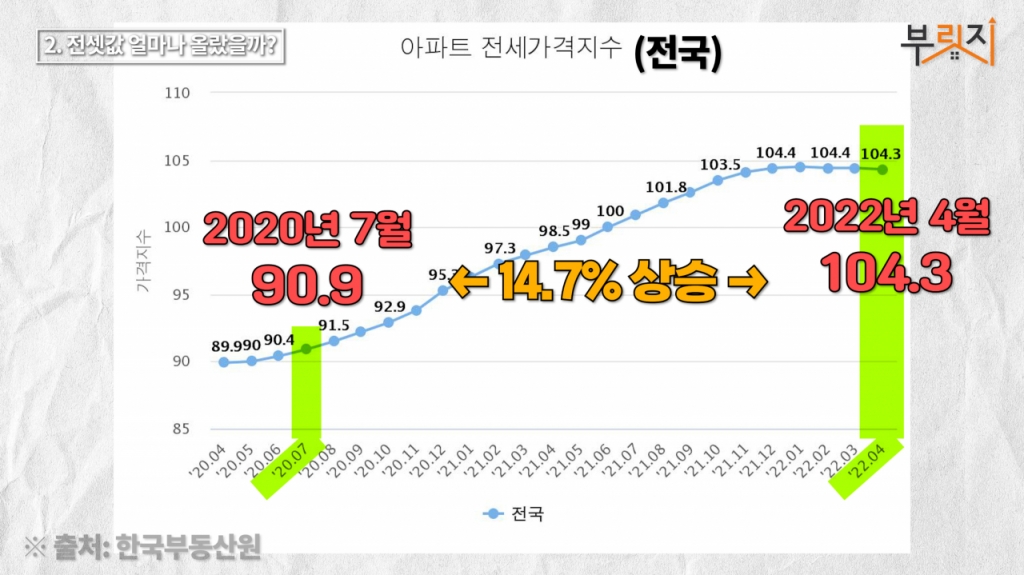 그렇다면 임대차2법이 시행된 2020년 7월 말 이후 전셋값은 얼마나 오른 걸까요. 한국부동산원에 따르면 2020년 7월 전국 아파트 전세가격지수( 2021.06 = 100)는 90.9로 2022년 4월 기준 104.3 대비 14.7% 올랐습니다. 수도권으로 범위를 좁히면 같은 기간 90.6에서 104.8로 15.7% 뜁니다. 이 기간 전셋값의 중앙값은 2억2586만원에서 2억6310만원으로, 수도권은 3억1137만원에서 3억9200만원으로 올랐습니다. 수도권 기준 중간값의 전셋집을 구하려면 2년 전 대비 8000만원이 더 필요하다는 겁니다. 중위값이 아닌 평균값으로 봐도 전국 기준 2억3692만원에서 3억1806만원으로 비슷하게 8000만원 올랐습니다.