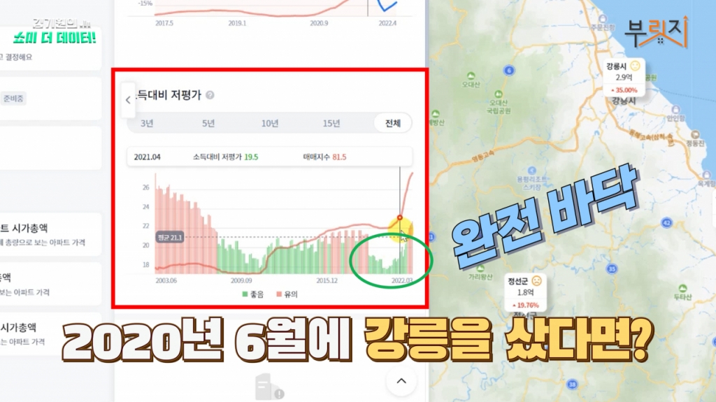 하지만 모든 데이터를 다 집약을 한 게 이 투자점수라는 거거든요. 강릉의 지금 투자점수도 2008년 이후로 계속 좋았죠? 지금이 제일 안 좋아요. 즉 강릉에 지금 투자하기 제일 안 좋다. 전세대비 저평가도 굉장히 지금 안 좋아요. 별로에요. 그다음에 소득대비해서도 가장 높죠? 지금? 입주물량도 좀 많아지고 그래서 지금의 강세를 좀 더 이어갈 수는 있지만 지금 와서 강릉의 세컨하우스를 사는 거는 제가 보기에는 그렇게 좋은 선택은 좀 아닌 거 같아요. 이미 이제 어깨 이상으로 지금 강릉도 올라갔다고 좀 보여지고 있고.