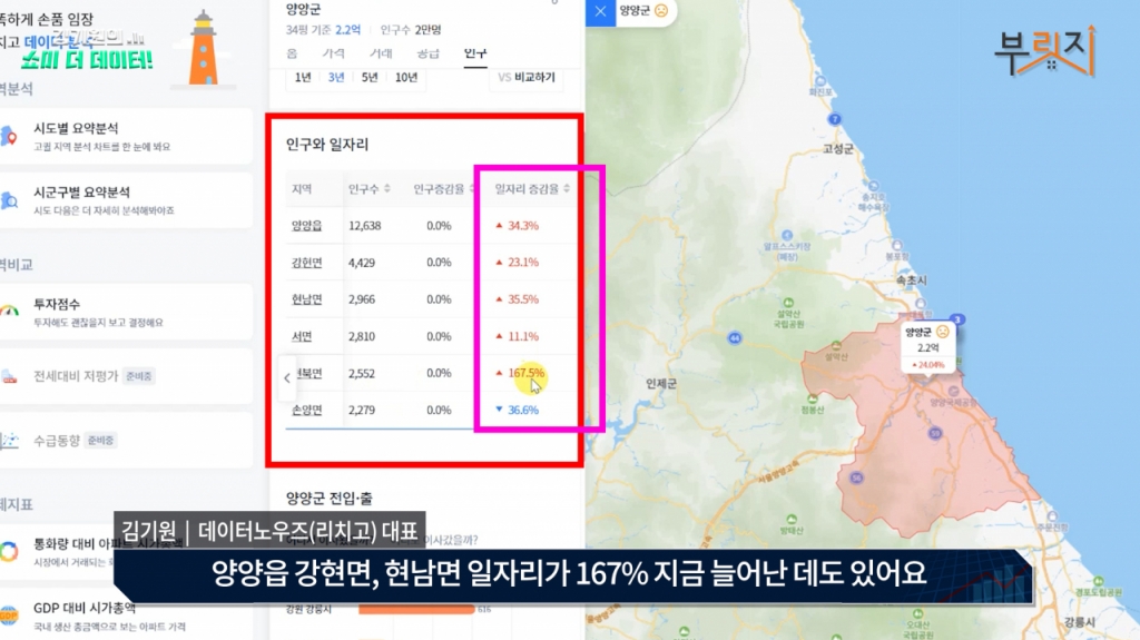양양읍 강현면, 현남면 일자리가 167% 지금 늘어난 데도 있어요. 갑자기 양양이 임장을 가고 싶은 마음이 좀 생기네. 일자리가 굉장히 많이 늘고 있고, 서핑이나 이런 것들 덕분에 일자리가 좀 많이 늘고 있는 거 같고,근데 새 아파트는 아예 없고 그런데 지금 매물도 바닥에서 조금 늘었지만 사실 의미가 없는 거고, 여전히 거래는 활발하고 있고. 양양에 지금 임장을 가셔도 괜찮을 거 같은데, 당장 의사결정을 하시는 것보다는 조금 상황을 보시면서 저라면 가을이나 연말 정도에 급매물 위주로 한 번 고민을 해볼 거 같아요.