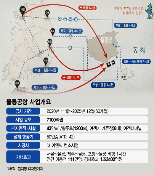 울릉공항은 바다 위에 지어진다. 국내 최대 규모의 해상공항이다. 평균 수심 23m, 최대 31m에 달하는 바다를 메워서 짓는 해양매립공사다. 인천국제공항의 평균 수심은 1m, 건설 예정인 가덕신공항의 수심은 20m다.