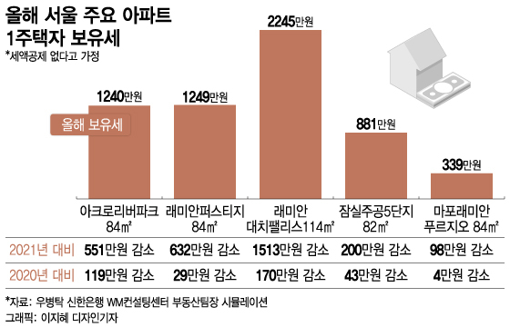 16일 머니투데이가 우병탁 신한은행 WM컨설팅센터 부동산팀장에 의뢰해 새 정부의 보유세 세제 변경에 따른 올해 보유세 예상액을 시뮬레이션한 결과 서울 서초구 아크로리버파크 전용 84㎡(1주택자)의 보유세는 1240만원으로 지난해 대비 551만원이 감소한 것으로 나타났다. 2020년 낸 보유세 대비로는 119만원 줄었다.