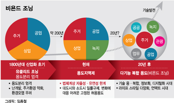 이처럼 용도지역제는 제한된 땅을 효율적이고 계획적으로 사용하기 위해 88년 전 도입됐지만 융·복합 시대에 따른 개발수요와 상관 없이 할 수 있는 것과 할 수 없는 것을 미리 규정해 경직성이 강하다.