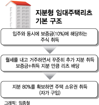 '지분형 임대주택리츠'의 기본구조는 입주자가 집값의 일부, 약 10%에 해당하는 보증금만 부담하고, 10년 안에 리츠 주식 매입을 통해 거주하고 있는 주택 지분의 대부분, 가령 80%를 취득하면 소유권이 부여되는 형태다. 보증금은 리츠 주식으로 취득할 수 있어, 입주와 동시에 주택 지분 10%는 확보하는 셈이다. 입주 후에는 임차인으로서 거주하면서 월세(임대료)를 내고 여윳자금이 생길 때 마다 리츠 주식을 추가 매입해 지분을 늘려가면 된다.