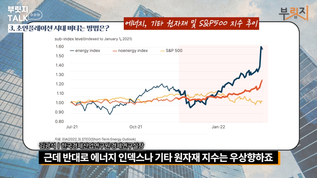 제가 작년 경제전망서에 원유에 투자를 하라고 조언했어요. 그 원유를 얼마 전까지 보유하고 있었으면 딱 좋았습니다. 그리고 원자재에 투자하라고 했어요. 실제 주가는 올해를 기점으로 계속 박스권에 갇히죠. 반대로 에너지 인덱스나 기타 원자재 지수는 우상향합니다. 지금 물가 상승 압력에 영향을 미치는 요인이 뭐예요? 원유나 원자재 가격 상승이에요. 물가 상승세가 생각보다 안 잡히는 이유는 2023년까지도 식료품 원자재 가격이 계속 상승하기 때문이에요. ☞자세한 내용은 머니투데이 부동산 유튜브 채널 '부릿지'에서 확인할 수 있습니다.