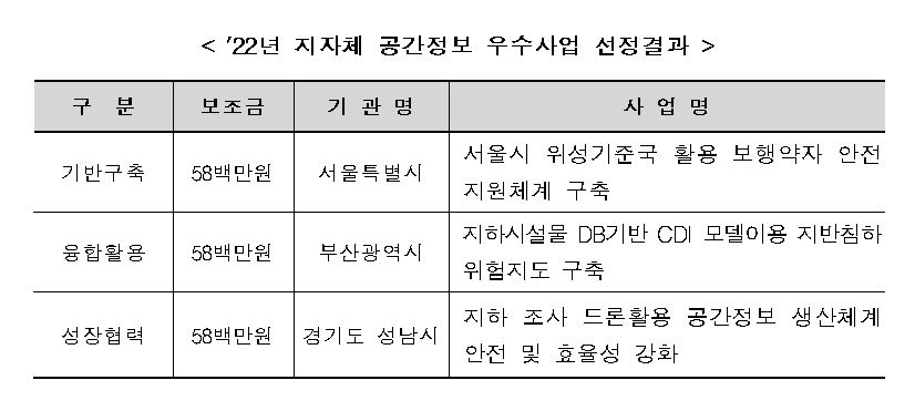 국토교통부는 전국 지방자치단체를 대상으로 진행한 '2022년 지자체 공간정보 우수사업' 공모에서 서울, 부산, 성남시 등 3개 지자체에서 제안한 사업을 최종 선정했다고 1일 밝혔다.