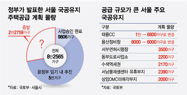 총 공급계획 물량 8만2565가구 가운데 사업승인이 완료된 9806가구를 제외하면 남은 물량은 7만2759가구다. 그러나 정부는 최근 대책에서 국공유지 계획 물량은 5만 가구로 잡았다. 2만2000가구 가까이 줄어든 것이다.