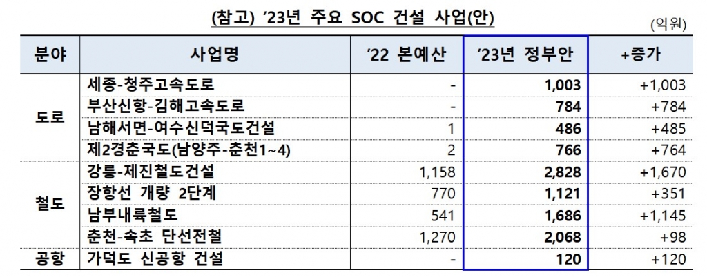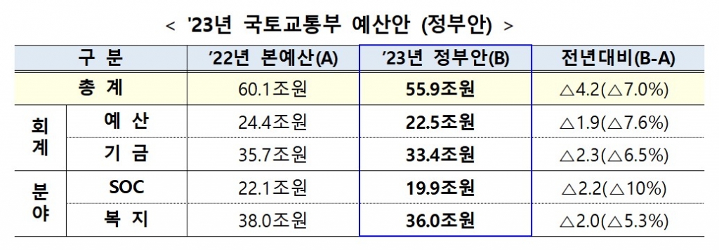 이우제 국토부 정책기획관은 "윤석열 정부가 재정정책 기조를 확장기조에서 건전재정 기조로 전면 전환한 것을 적극 반영해 지출 구조를 효율화 했다"며 "감소폭이 큰 SOC 분야의 경우, 연차별 투자계획, 현재 진행 정도, 예상 이월금액 등을 종합 고려해 적정소요를 반영하도록 했다"고 설명했다.