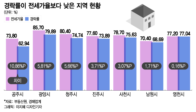 6일 머니투데이가 전국의 최근 6개월 간 아파트 평균 경락률을 전수조사한 결과, 경락률이 전세가율보다 낮은 지역은 총 7곳으로 집계됐다. 충북 청주와 충남 공주, 전북 남원, 전남 광양, 경북 영천, 경남 진주·사천 등으로 모두 지방 중소도시다.