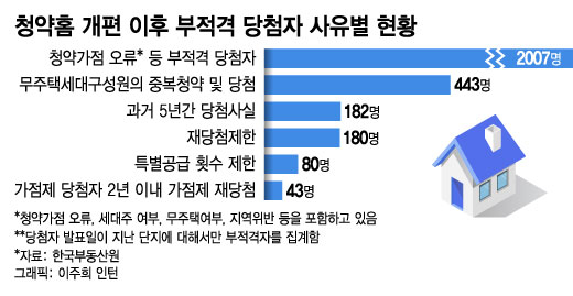 이런 노력에도 불구하고 개편 이후 부적격 당첨 사례 중 청약가점 오류, 세대주 여부, 무주택 여부, 지역 위반 등으로 인한 부적격이 2007명으로 가장 많은 것으로 나타났다. 전체 부적격 당첨자의 70%에 육박하는 수준이다.