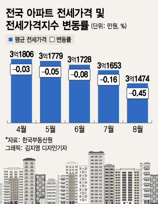 한국부동산원에 따르면 지난 8월 기준 전국 아파트 평균 전세가격은 3억1474만원으로 집계됐다. 작년 12월 3억1952만원을 기록한 후 8개월 연속 하락세를 이어가고 있다. 전세가 하락폭은 급격히 커지는 추세다. 최근 5개월 간 전국 전세가격지수 변동률은 -0.03%→-0.05%→-0.08%→-0.16%→-0.45%로 확대됐다. 8월 기록한 -0.45%는 2019년 4월 이후 3년 4개월 만에 최대 낙폭이다.