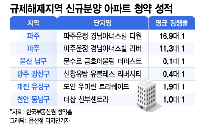 규제지역에서 해제된 파주 청약 시장이 뜨겁게 달아올랐다. 최근 분양한 2개 단지에 수천명이 몰리면서 청약 경쟁률이 두자릿수를 기록했다. 울산 광주 대전 천안 등 다른 규제지역에서 무더기 미달사태가 난 것과 대조적이다.