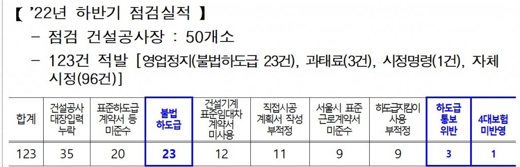 서울시가 지난 9월부터 11월까지 서울시?자치구가 발주한 건설공사장 중 50곳을 선정해 불법하도급 등에 대한 고강도 집중점검을 실시한 결과 점검 현장의 34%에 해당하는 17개소에서 불법하도급 23건을 적발했다.