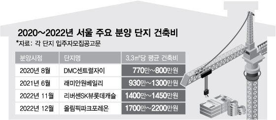 5일 머니투데이가 2020년~2022년 서울에서 분양한 주요 아파트 단지 입주자모집공고문을 분석한 결과 3.3㎡당 분양가에 포함된 건축비가 2년 만에 약 2배 상승했다.