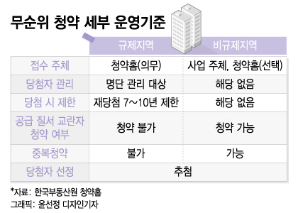 정부도 이런 문제점을 인지하고 있지만 시장 침체 국면이어서 고심이 깊다. 국토교통부 관계자는 "공급질서 교란자에 대해선 청약 유형과 관계 없이 일정 기간 재당첨을 제한하는 게 현행법 취지에 맞는다"며 "비규제지역 무순위청약까지 청약홈 접수를 의무화하면 해결될 문제지만, 최근 청약 시장 분위기가 워낙 침체해 쉽게 결정하기 어려운 문제"라고 말했다.