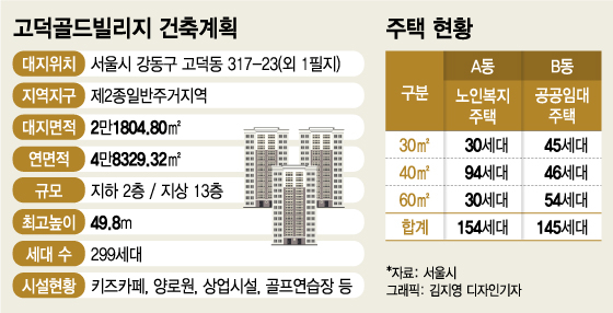29일 서울시에 따르면 시는 최근 이 같은 내용이 담긴 '시립고덕양로원 부지 내 골드빌리지 조성 계획'을 수립했다. 연면적 약 4만8329㎡에 지하 2층·지상 13층 규모로 지어지며, 총 세대수는 299세대다. A동(노인복지주택·154세대), B동(공공임대주택·145세대) 크게 두 동으로 나뉘어 부모가구 옆에 자녀가구가 거주할 수 있도록 하는 방식이다.
