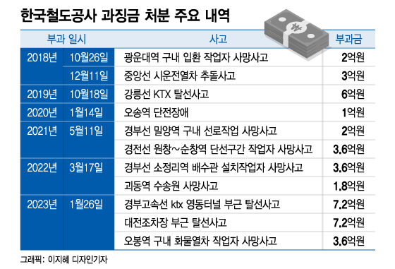 코레일은 앞서 올해 1월에도 탈선과 작업자 사망 등 열차사고 3건과 관련, 과징금 18억원을 부과받았다. 처분을 받았던 사고 3건은 △경부고속선 대전-김천구미역 KTX 열차 궤도이탈(2022년1월5일) △경부선 대전조차장역 SRT 열차 궤도이탈(7월1일) △남부화물기지 오봉역 직원 사망사고(11월5일)이다. KTX와 SRT 탈선사고에는 각각 7억2000만원을, 오봉역 사망사고는 3억6000만원을 부과했다.