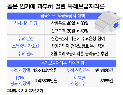 특례보금자리론을 신청하고 대출금을 받기까지 걸리는 시간이 최대 두 달로 늘어났다. 출시 17일만에 13조원 넘는 신청액이 몰리면서 과부하가 걸린 영향이다. 이에 따라 앞으로는 일반 주요 은행에서도 특례보금자리론을 신청·심사할 수 있게 된다.