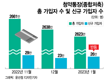 월별 종합저축 '신규' 가입자수는 작년 8월 30만명을 기록했으나 11월 29만명으로 내려앉은 후 12월에는 23만명으로 대폭 줄었다. 그러다 올 1월 다시 26만명으로 반등했다. 청약통장 가입기간이 6개월이 채 안된 '청린이(청약+어린이)'도 작년 12월 153만3600명에서 1월에는 153만6708명으로 늘었다.