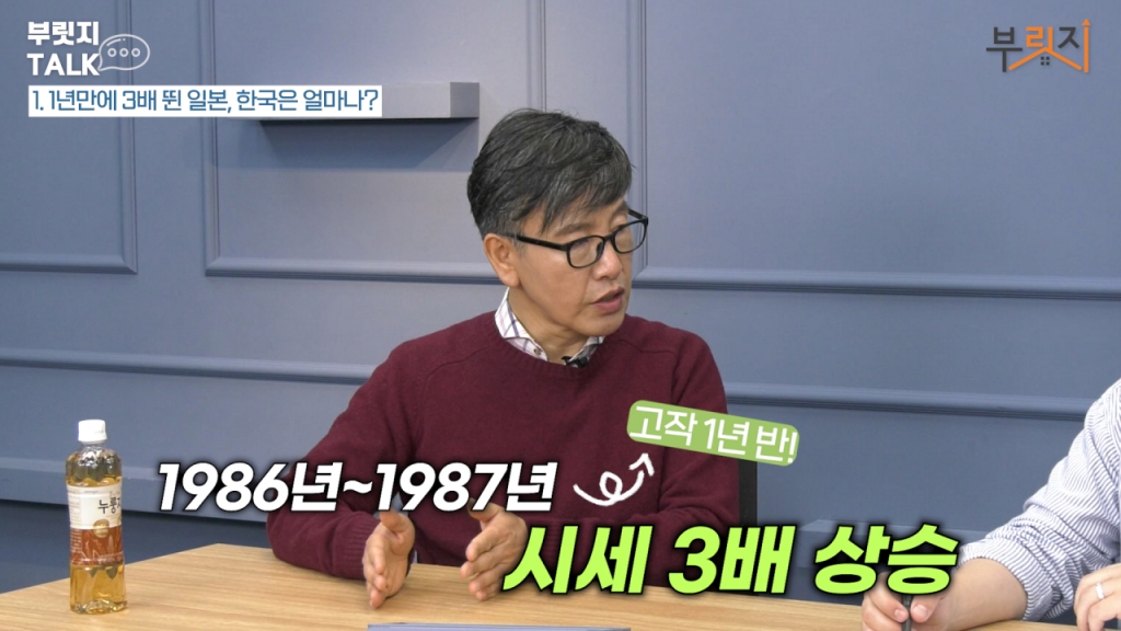 1981년서부터 1991년까지 10년간을 보면 4배, 5배가 올랐어요. 근데 86년에서 87년 사이가 3배가 오른 거예요. 1년 반 정도 만에 3배가 오른 겁니다. 그래서 일본을 버블이라고 하는 거죠. 근데 이거를 일본 정부가 그냥 버려뒀냐? 일본도 토지거래 감시구역제도를 만들어요. 투기하는 세력들을 좀 잠잠하게 하려고 했지만 멈춰지지는 않죠. 그렇게 하다 보니까 이제 책에서도 1억 명 부동산 업자라는 말을 쓴 것은 전 국민이 다 뛰어들었다는 거죠.