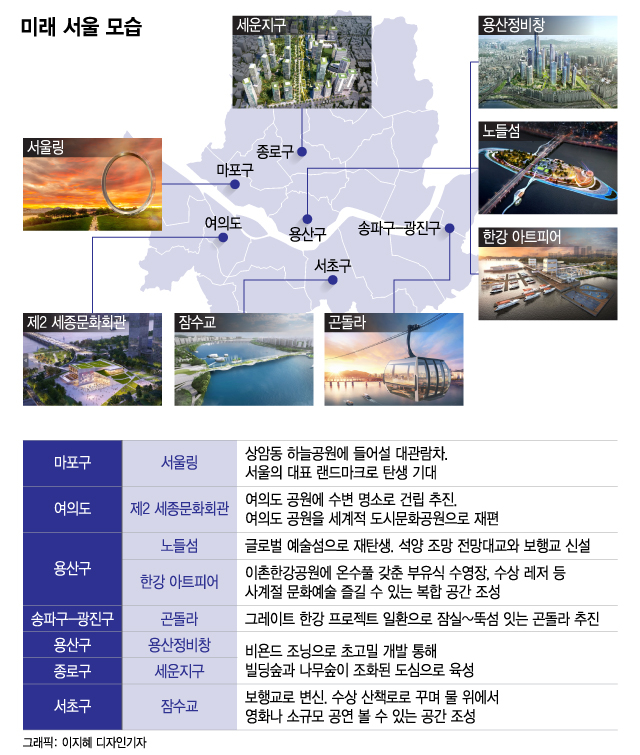 오세훈 서울시장은 미래 서울의 청사진을 발표하는 자리에서 "사는 것이 즐거운 도시, 자부심이 느껴지는 도시를 만드는 게 꿈"이라며 "'한강 수변과 건축물이 기가 막히게 아름답다', '나도 이런 곳에서 살고 싶다'는 반응이 나올 수 있도록 서울을 만들 것"이라고 했다.