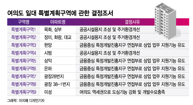여의도 아파트지구를 총 9개 특별계획구역으로 지정해 입지 특성에 맞게 개발한다는 게 골자다. 1구역 △목화 △삼부, 2구역 △장미 △화랑 △대교, 3구역 한양, 4구역 시범, 5구역 삼익, 6구역 은하, 7구역 광장 28번지, 8구역 광장 38-1번지, 9구역 미성 등이 특별계획구역으로 신설됐다.