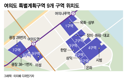 한강과 인접한 1·2·4구역은 공공시설용지 조성과 주거환경 개선이 이뤄진다. 금융중심 특정개발진흥지구와 가까이 잇는 3·5·6·7·8구역은 상업 업무 지원기능을 유도한다는 계획이다. 여의도역 역세권에 입지한 9구역은 도심기능 강화를 위한 개발이 진행된다.