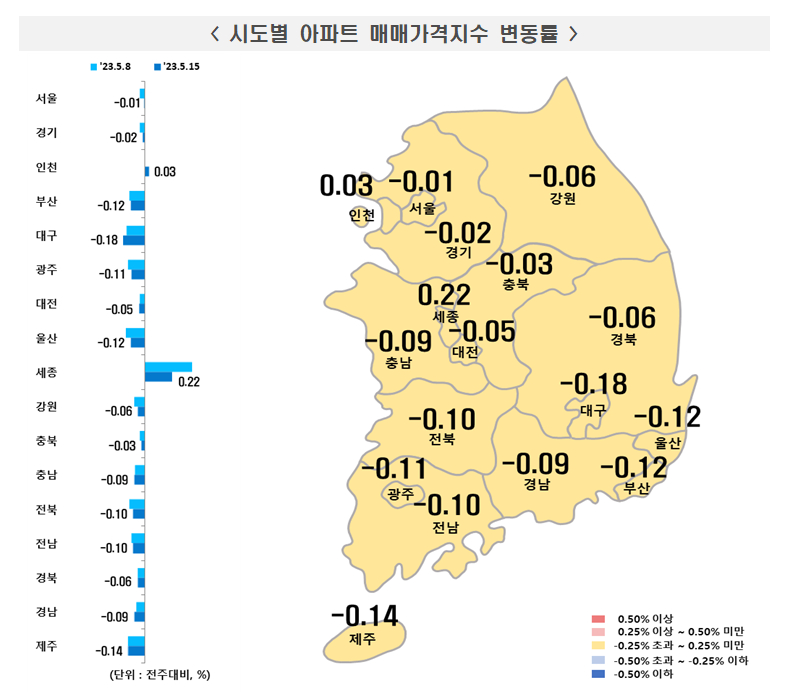 전국 아파트 매매가격은 0.05% 하락하면서 전주(-0.07%) 대비 낙폭이 줄었다. 수도권(-0.04%→-0.01%)과 지방(-0.09%→-0.09%) 모두 하락폭이 둔화했다. 전국 주요 지역 가운데서는 세종(0.22%)은 9주째 상승했다.