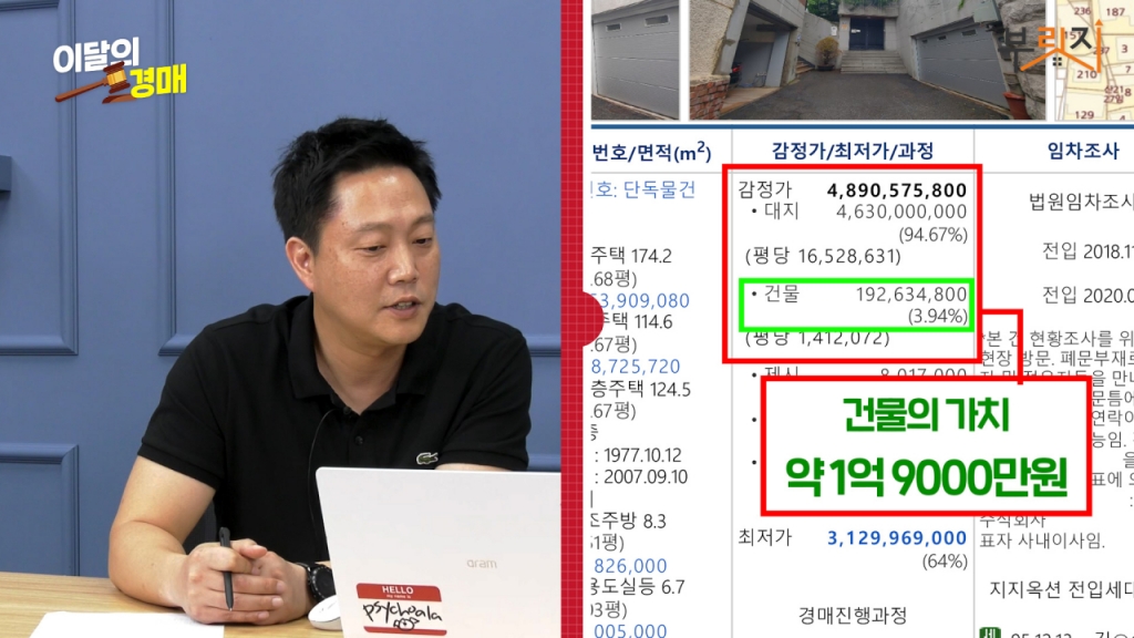 단독 주택 같은 경우는 감정가를 보시면 아시겠지만 지금 감정가격이 토지와 건물로 나누어서 감정이 매겨져 있는데 토지 감정가격이 거의 전체 감정가격의 95%에요. 그리고 건물 가격이 3.9%밖에 안 합니다. 건물의 가치는 거의 1억9000만 원 정도밖에 안 하는 거죠.