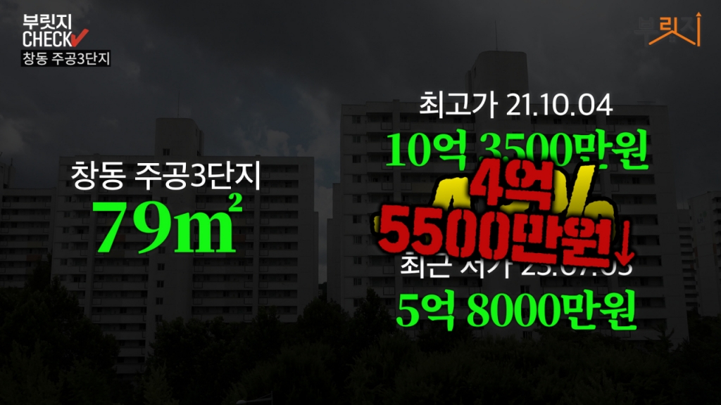 도봉의 집값은 거의 반토막 났습니다. 주공3단지 전용 79㎡는 지난달 3일 5억8000만원에 거래되며, 최고가 10억3500만원보다 43%, 4억5500만원 낮춘 가격에 손이 바뀌었습니다. 다른 지역이 반등했다는 5월 이후 추가 하락은 도봉구의 현재 상황을 보여주고 있죠.