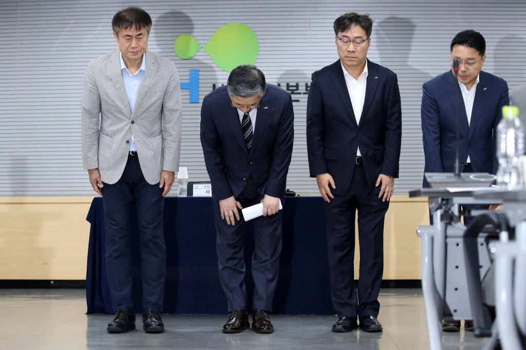 ![[서울=뉴시스] 조성우 기자 = 이한준 한국토지주택공사(LH) 사장(왼쪽 두 번쨰)이 11일 오전 서울 강남구 LH 서울지역본부에서 열린 긴급 기자회견에서 고개를 숙이고 있다. 2023.08.11.](https://thumb.mt.co.kr/cdn-cgi/image/f=avif/21/2023/08/2023081616024234101_1.jpg)