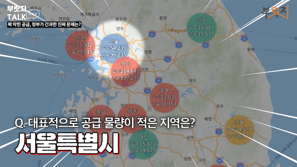 대표적으로 공급 물량이 적은 곳이 어디일까요? 서울밖에 없어요. 반면에 보면 경기도라든지 충북, 세종 여기는 내년까지 공급 물량이 좀 많아요. 그러면 이제 공급 문제가 이제 뭐 좀 지금 정부에서 공급 문제 이야기하는 게 좀 과장된 거냐? 그렇진 않아요. 그렇진 않고 공급 문제가 이제 왜 심각해지는지 한번 이렇게 살펴보겠습니다.