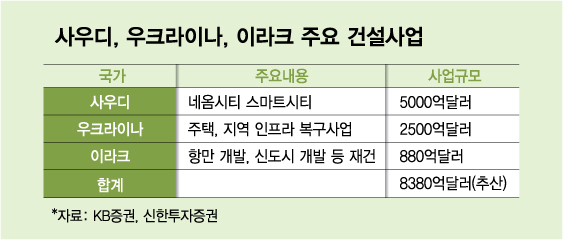김선미 신한투자증권 연구원은 "최근 건설사들의 해외부문에 대한 의지가 다시 높아지고 있는데 다양한 기회들이 확인되고 있기 때문"이라며 "한국 정부는 국내 재건사업 기회가 520억달러(한화 약 70조원) 수준이라 추산했고 운송, 에너지, 전력, 모듈러 건축 등이 주요타겟"이라고 말했다. 이어 "우크라이나 정부의 직접적인 참여 요청이 있었던 만큼 국내 건설사 수혜 가능성은 크다"면서도 "외부투자 및 지원금에 의존하는 만큼 우크라이나 재건사업 속도는 더딜 전망"이라고 덧붙였다.