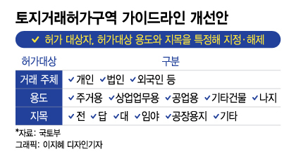 국토부 관계자는 "가령 기획부동산 투기가 예상되는 지역이라면 허가대상자를 '법인'으로, 허가대상 지목을 '임야'로 특정해서 해당 토지거래허가구역 내에서는 '법인이 임야를 거래할 때' 허가를 받아야 하도록 규제하는 방식"이라고 설명했다.