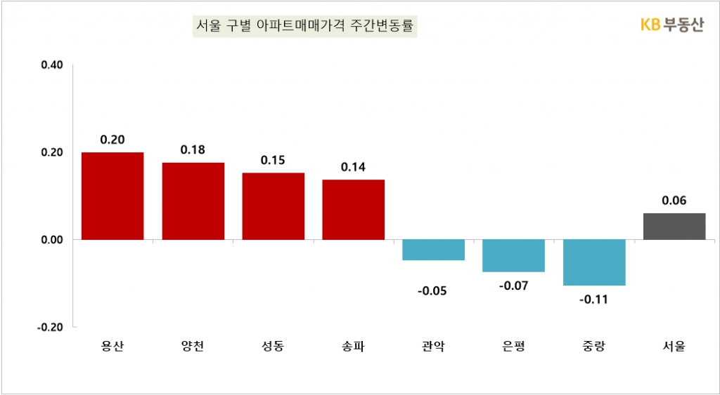 이번주에는 특히 용산구(0.20%)의 상승세가 두드러졌다. 이어 양천구(0.18%), 성동구(0.15%), 송파구(0.14%) 순으로 크게 올랐다.